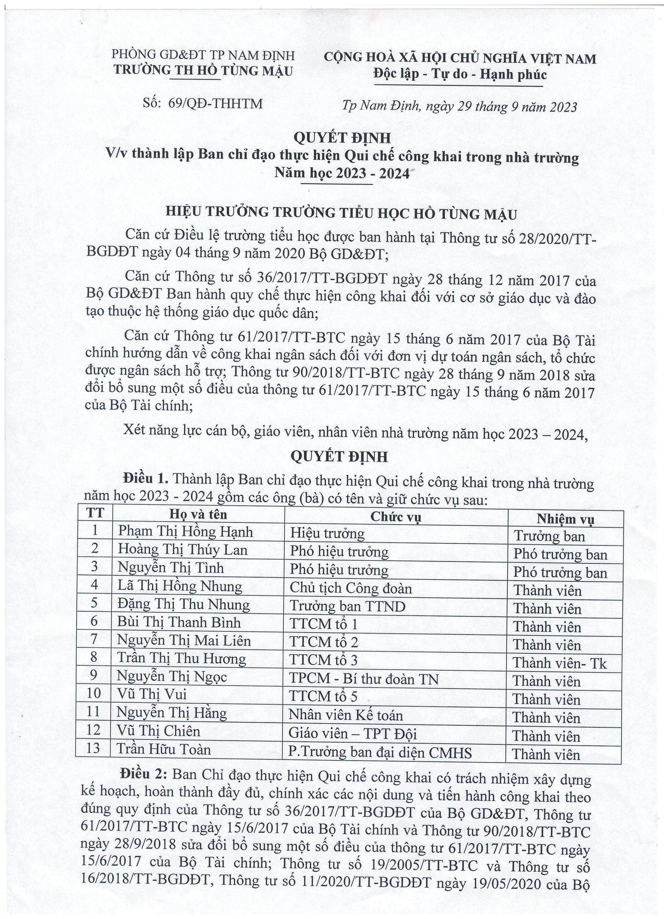 QĐ ban chỉ đạo thực hiện Qui chế công khai trong nhà trường & Bảng phân công nhiệm vụ năm học 2023-2024